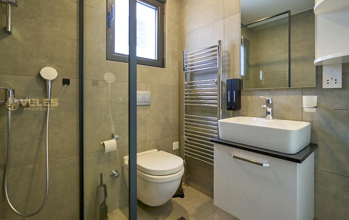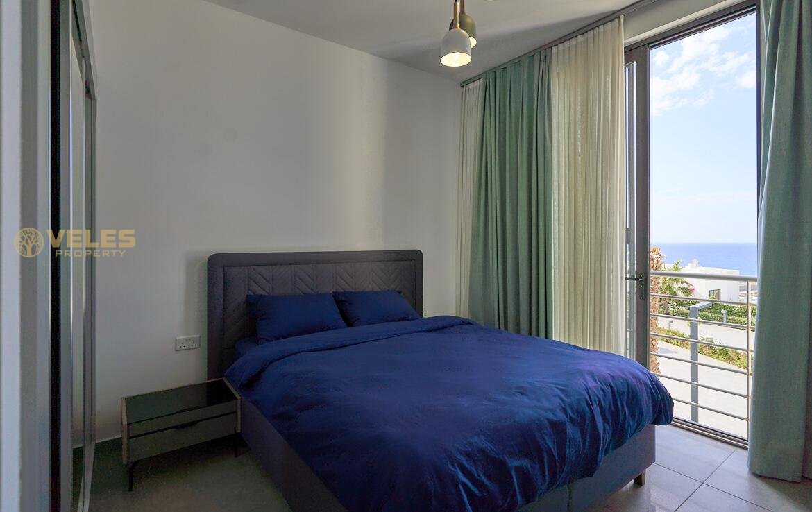 Apartament obejmuje przestronny taras z panoramicznym widokiem, dwie sypialnie i dwie łazienki, wykonane z eleganckim wykończeniem oraz wbudowanymi meblami.