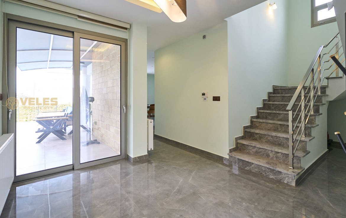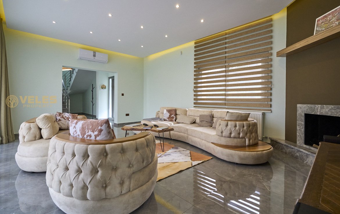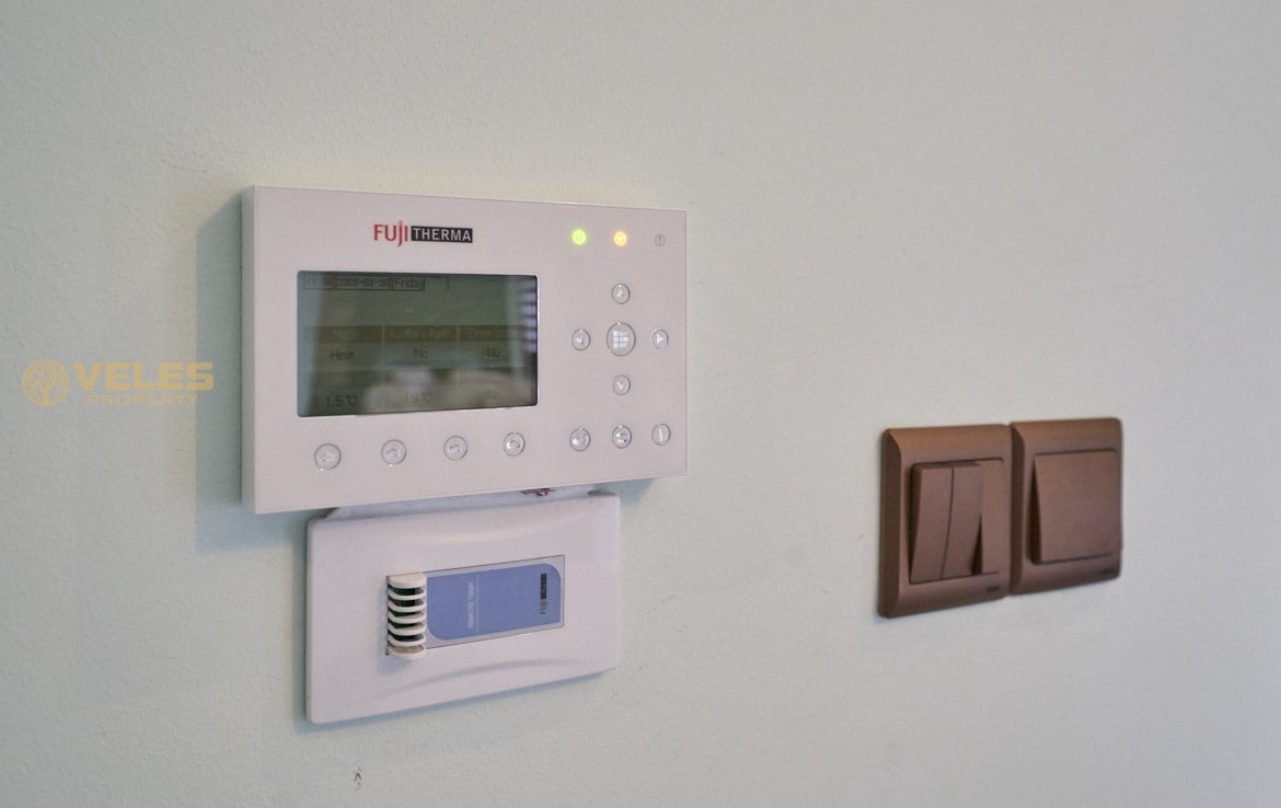 Willa składa się z 3 sypialni, 3 łazienek, przestronnego salonu z kominkiem, osobnej kuchni z zabudową oraz tarasu z wyjściem do basenu o wymiarach 10×5 m. Zainstalowano ogrzewanie podłogowe, pompę ciepła oraz panele słoneczne. Na posesji znajduje się parking na 3 samochody.
