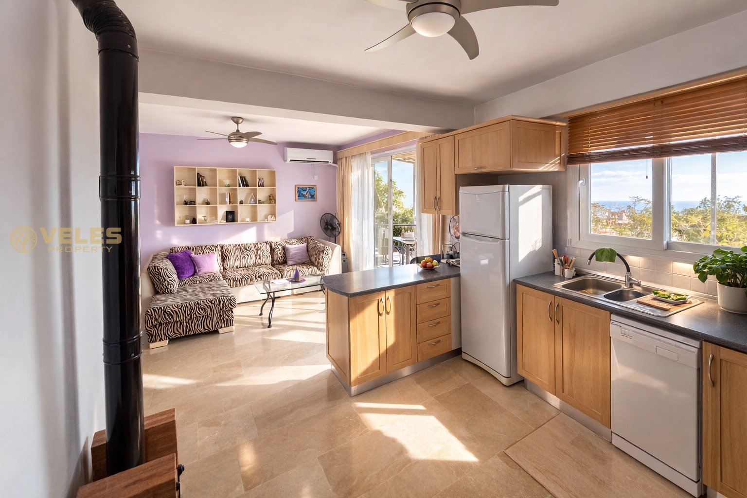 Przytulne mieszkanie z tarasem na dachu znajduje się w zamkniętym kompleksie mieszkaniowym z barierą. Okna i taras oferują malowniczy widok na Morze Śródziemne i góry, tworząc atmosferę komfortu i spokoju.